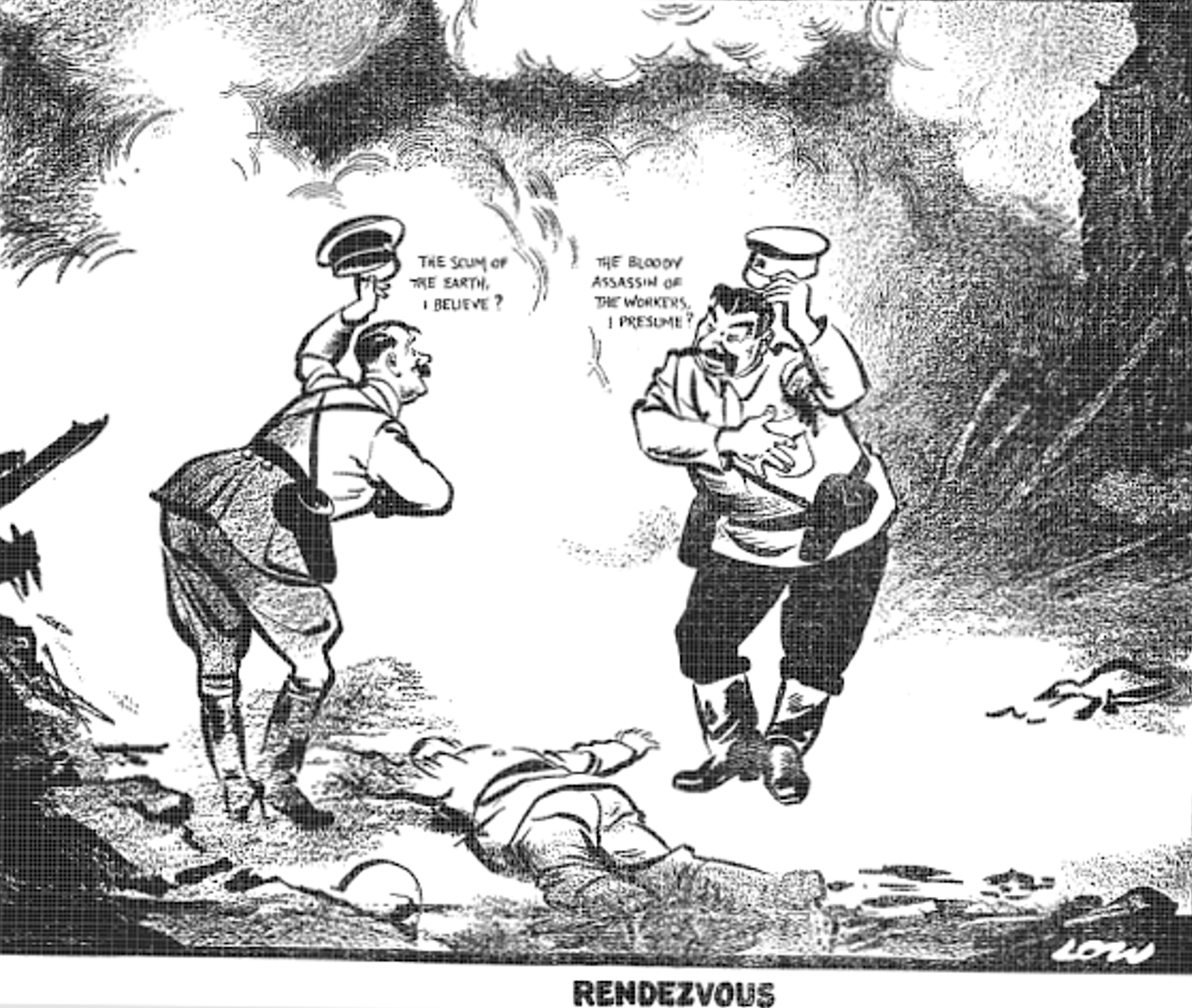 A cartoon drawn by David Low on the subject of the August 1939 Nazi-Soviet Pact, a non-aggression aggreement between Adolf Hilter (1889-1945), leader of Nazi Germany, and Joseph Stalin (1878-1953), leader of the USSR. Both dictators had spent years attacking each other and their respective ideologies before suddenly signing the agreement which carved up Europe between them, starting with Poland, which is represented by the corpse between Hitler and Stalin in the picture. The cartoon first appeared in the British Evening Standard newspaper in 1939.