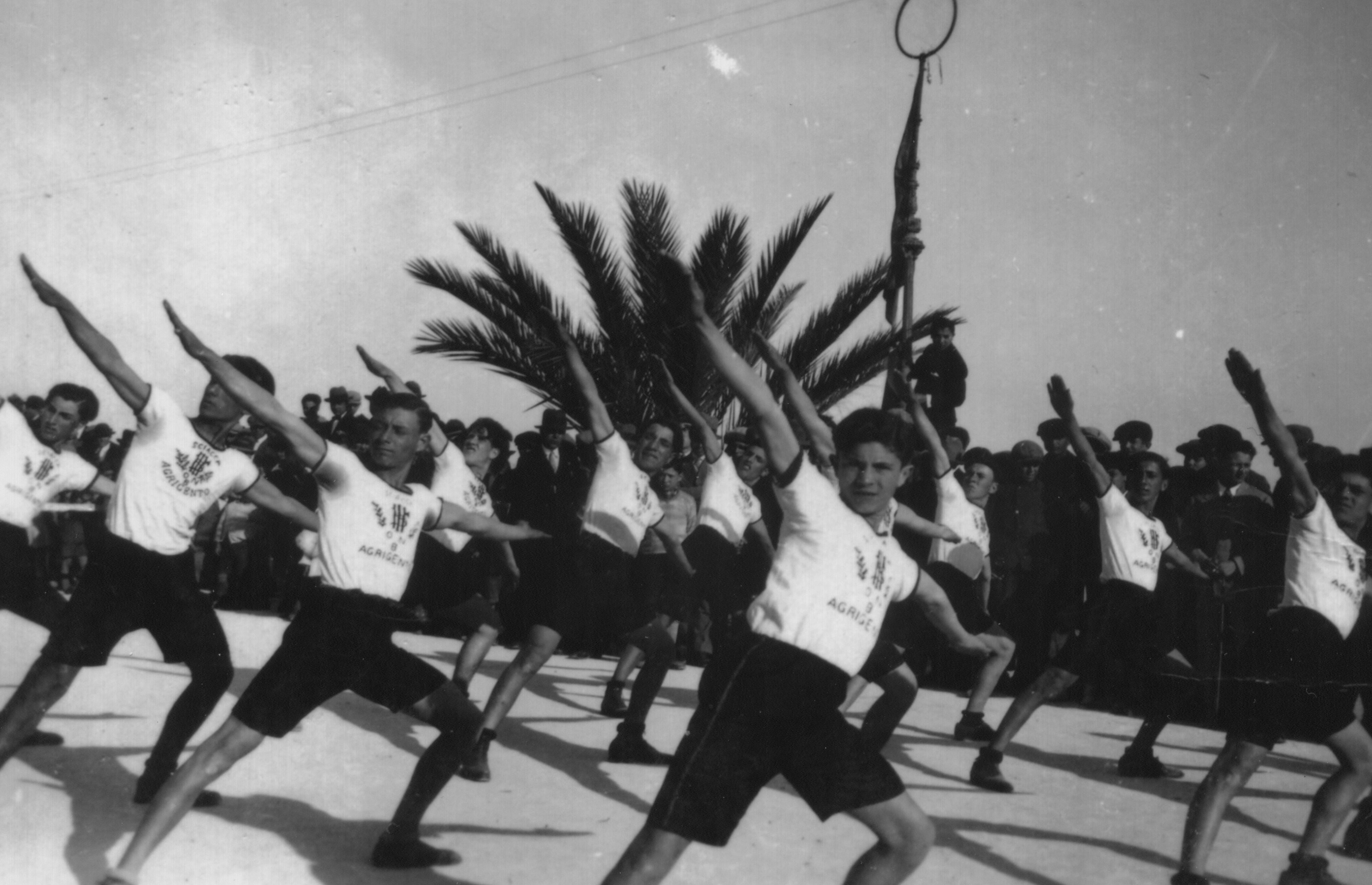A c. 1923 photograph showing a public gymnastic show performed during the Italian fascist period by the Sciacca-Agrigento section of the Opera Nazionale Balilla. (Riggio Family Archives)